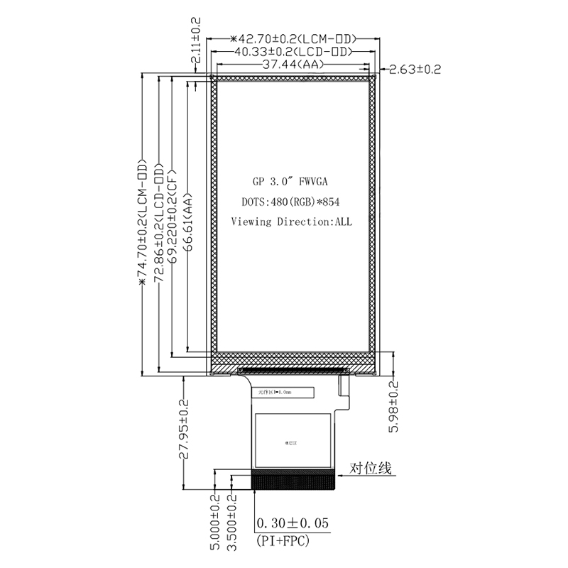 LCM外形尺寸 LCM Dimension | 42.70*74.70*2.50 | mm |