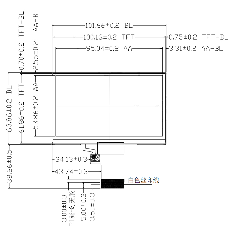 LCM外形尺寸 LCM Dimension | 101.66*63.86*2.60 | mm |