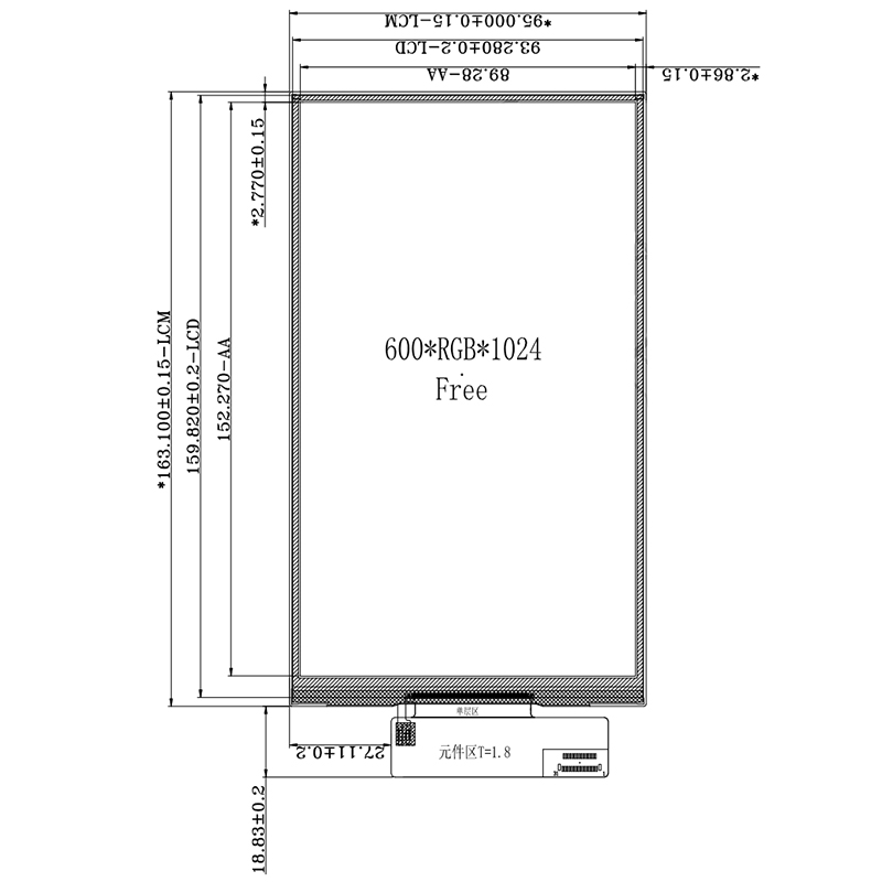 LCM外形尺寸 LCM Dimension | 94.90*163.10*2.55 | mm |