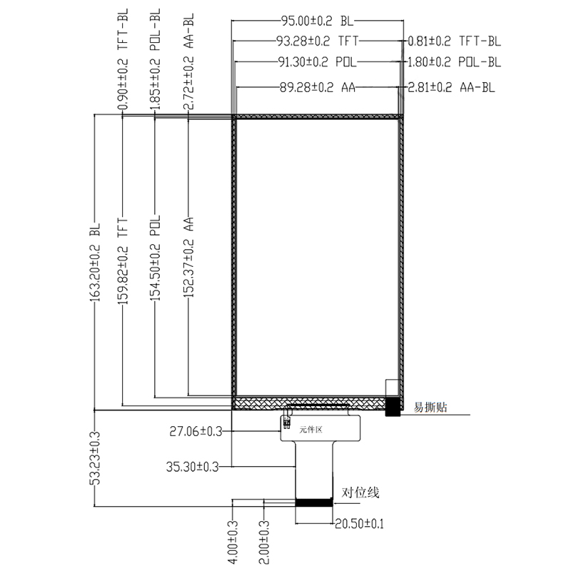 LCM外形尺寸 LCM Dimension | 94.90*163.10*2.55 | mm |