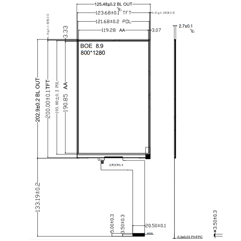 LCM外形尺寸 LCM Dimension | 125.48*202.90*2.60 | mm |
