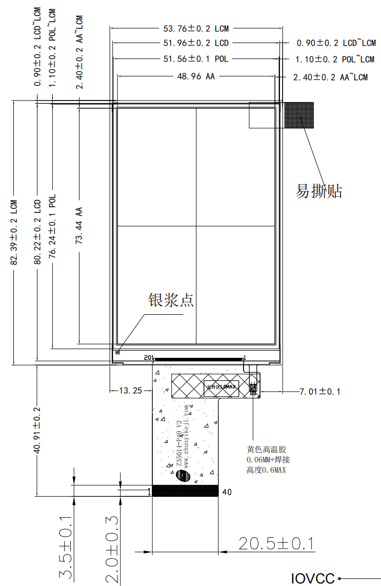 LCM外形尺寸 LCM Dimension | 53.76*82.39*2.23 | mm |
