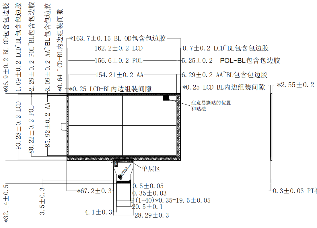 LCM外形尺寸 LCM Dimension | 163.7*96.9*2.55 | mm |